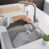 20 inch Over The Sink Roll-up Dish Drying Rack (Light Gray) by?Stylish® A-900GY This is a must-have in your kitchen, no home should be without this multi-functional accessory. STYLISH® Multipurpose Roll-Up Dish Drying Rack saves space and keeps your counters free of clutter by creating a multi-functional workspace directly over your kitchen sink. Place it over the sink to wash fruits and vegetables and to dry dishes and produce or use it as a rinsing rack. Made from heavy-duty stainless steel and coated with BPA-free silicone that protects your countertop and heavy cookware, this rolling mat can easily support up to 42 lbs. without bending. Heat-safe up to 200°C (400 F), it is perfect to use as a trivet as it protects your kitchen countertop from hot pots and hot baking sheets coming from the oven. The space-saving design conveniently rolls up for easy storage in any kitchen cabinet. Available in three different colors to blend with any kitchen decor.