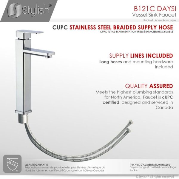 Add equilibrium and elegance to your bathroom with the beautiful single handle vessel sink bathroom faucet. The sleek rectangular shape, the rounded edges and the contemporary flare makes this Stylish Vessel Bathroom Faucet a brilliant addition to your bathroom. This vessel sink faucet features ceramic disc cartridges and solid brass construction for longevity and watertight functionality. This bathroom faucet is made using top-quality components, including a ceramic cartridge for reliable drip-free use and a best-in-industry aerator to reduce water waste without compromising pressure. Our bathroom faucet is made from solid brass and comes in a chrome colour. Designed for a single hole installation with integrated hot-cold supply lines for standard US and Canada plumbing connections. It features a sleek single lever handle for easy operation and temperature control. Smooth surface plating not only prevent scratches, but it is also easy to clean up. This modern bathroom faucet is easy to install and comes with installation instructions, all mounting hardware and hot-cold waterlines included. A deck plate is not included (escutcheton)