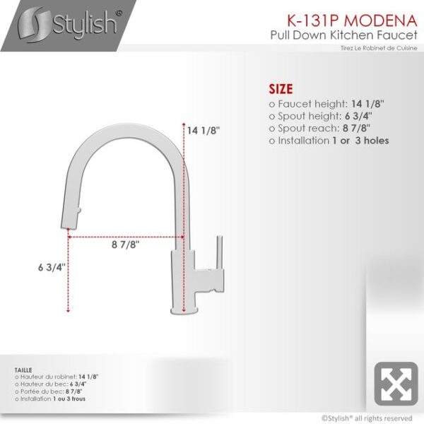 The Majestic curve gives Modena K-131 by Stylish Single Handle Pull Down Kitchen Sink Faucet a tasteful and sophisticated look. This solid stainless-steel kitchen or bar sink faucet has a clean, bold design that suits any modern or contemporary kitchen décor.