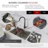 This single bowl workstation kitchen sink, from the Stylish Completo series is engineered to deliver great functionality, style, and value. This 31-inch workstation sink includes a set of modern and elegant accessories: one protective stainless-steel bottom grid, one steel silicone-coated black drying rack, one strainer, one black cutting board and one slim stainless-steel colander. Its ledge on the longer sides of the sink allows the accessories to fit and slide perfectly for efficient use. It features a sloped basin with grooves for fast water drainage and underneath it is covered with extra thick pads on all sides for silent use. It also includes extra coating that will protect your kitchen cabinet from condensation. This sink is made from premium material, using the thickest 16-gauge 304 stainless steel with 18/10 chrome/nickel content, and featuring a commercial-grade satin finish to hide marks and scratches. This sink features gently rounded corners all around, making cleaning as simple as wiping the surface with a damp cloth. This sink is designed to be installed as drop-in or undermount, it includes the installation hardware and comes with an all-metal drain straine