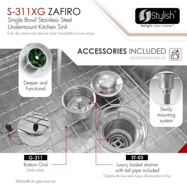 Included are a luxury basket drain strainer, deeper and more functional for catching food scraps, and a stainless steel bottom grid to protect the sink’s surface.