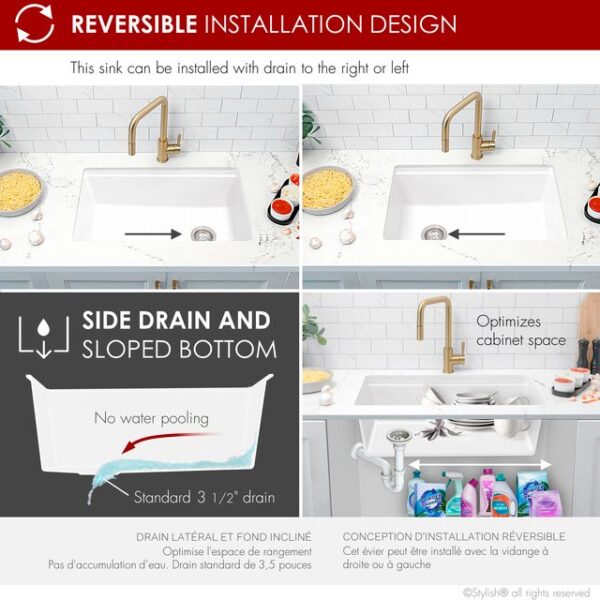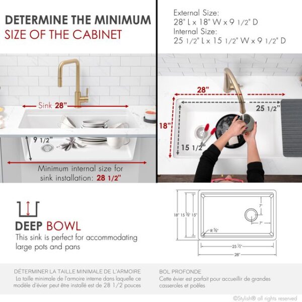 Upgrade your kitchen with our 28-inch composite granite workstation sink, blending clever modern design with exceptional functionality. Crafted with 80% natural quartz, this sink is durable, low-maintenance, and lighter than solid granite. The included strainer, drying rack, colander, and bamboo cutting board enhance your kitchen experience, conveniently fitting on the ledge. Highly resistant to dirt, the sink is easy to clean and can be dual-mounted over the countertop or as an undermount for a seamless look. The deep 9.5-inch bowl accommodates large cookware, while the thick granite minimizes noise. The reversible installation allows you to choose the drain’s placement, and it’s available in Black, Gray, and White, ensuring lasting color. Included are installation instructions and hardware for your convenience. Elevate your kitchen with this sleek, quiet, and versatile composite granite workstation sink